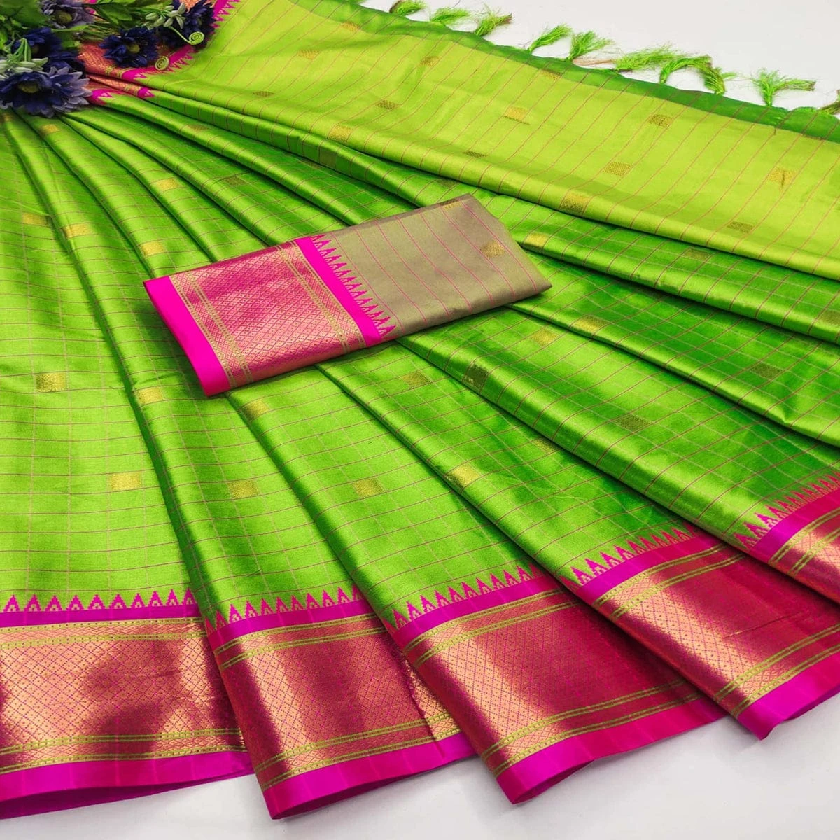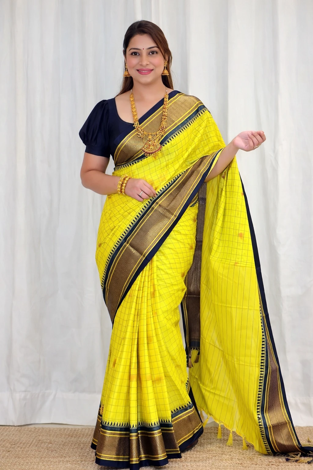 Beautiful contrast borders woven with gold zari for a festive and graceful finish.