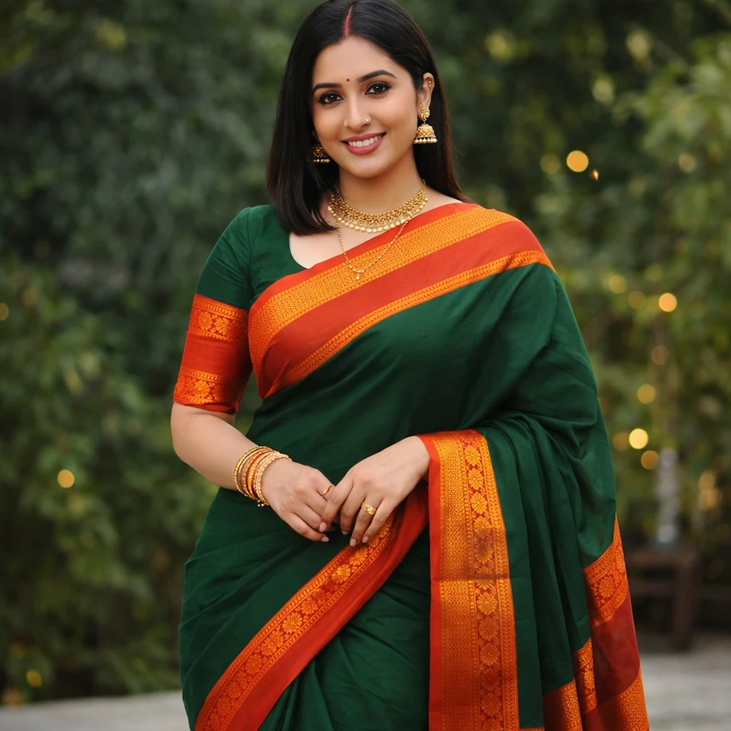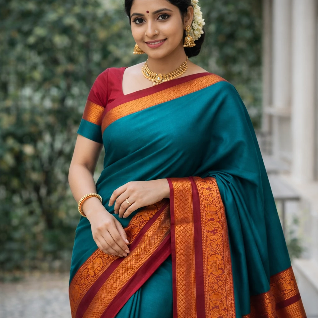 Easy to pair with designer blouses, heavy bridal jewelry, or temple ornaments.