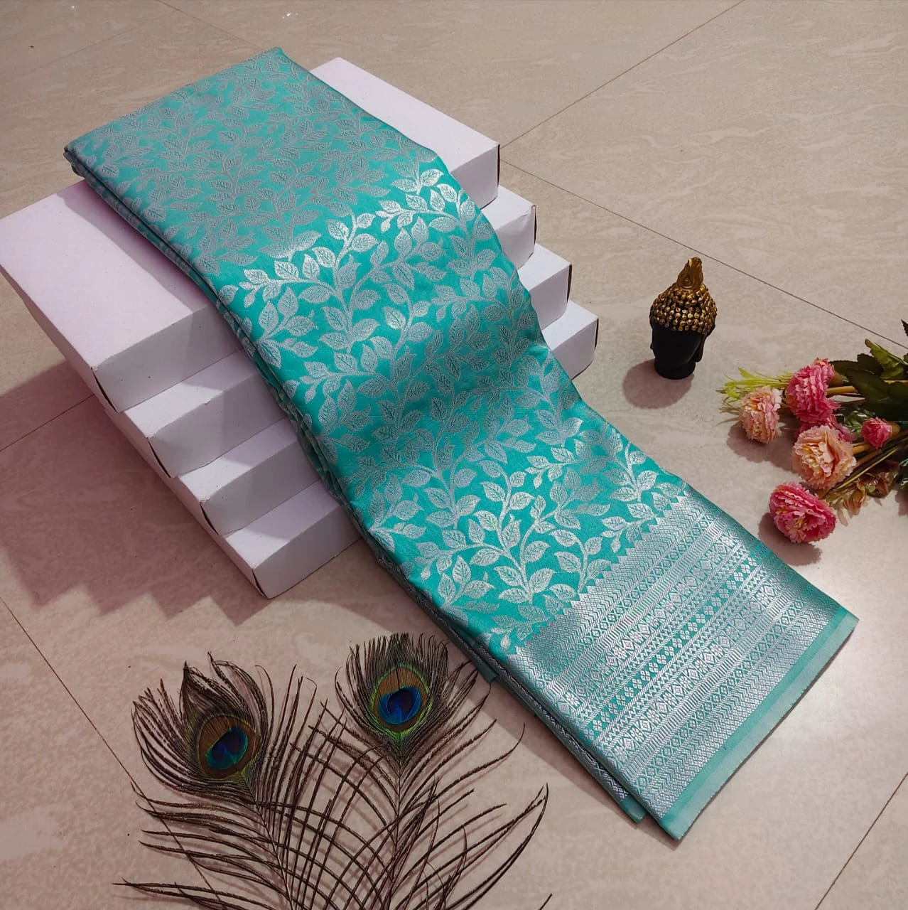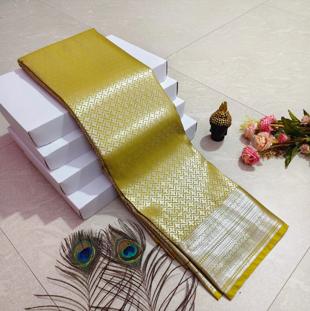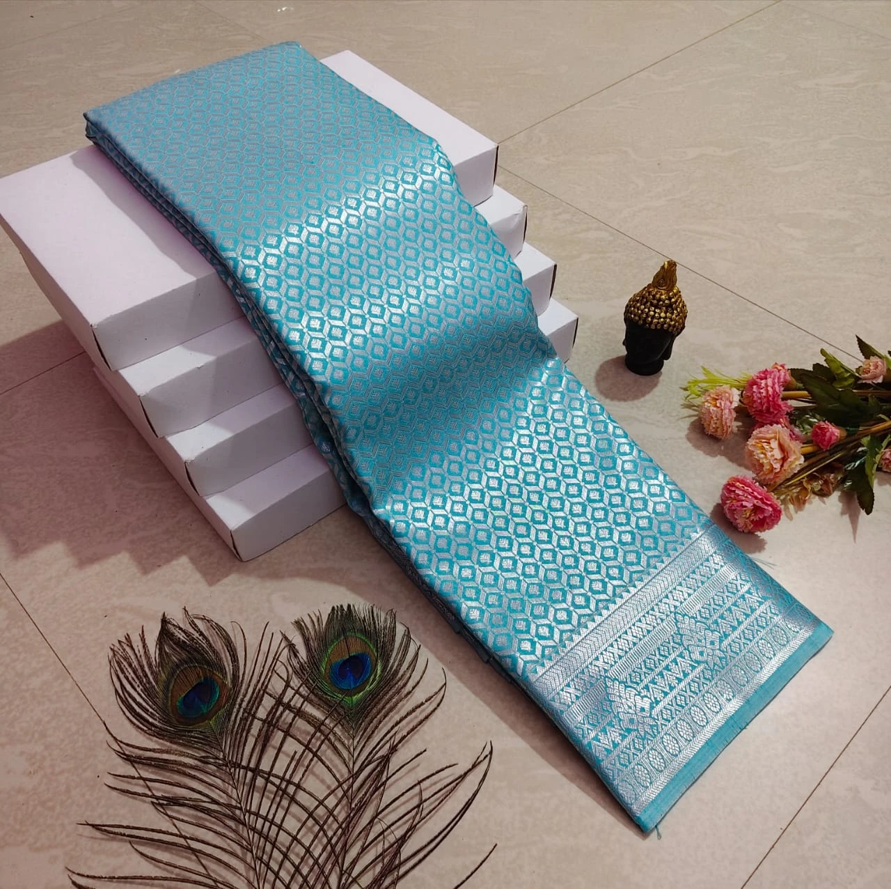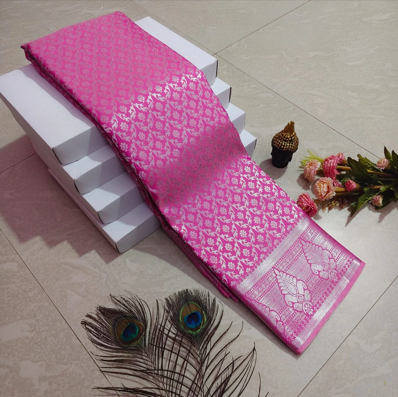 Beautiful silver or gold zari borders and woven motifs enhance the traditional appeal.