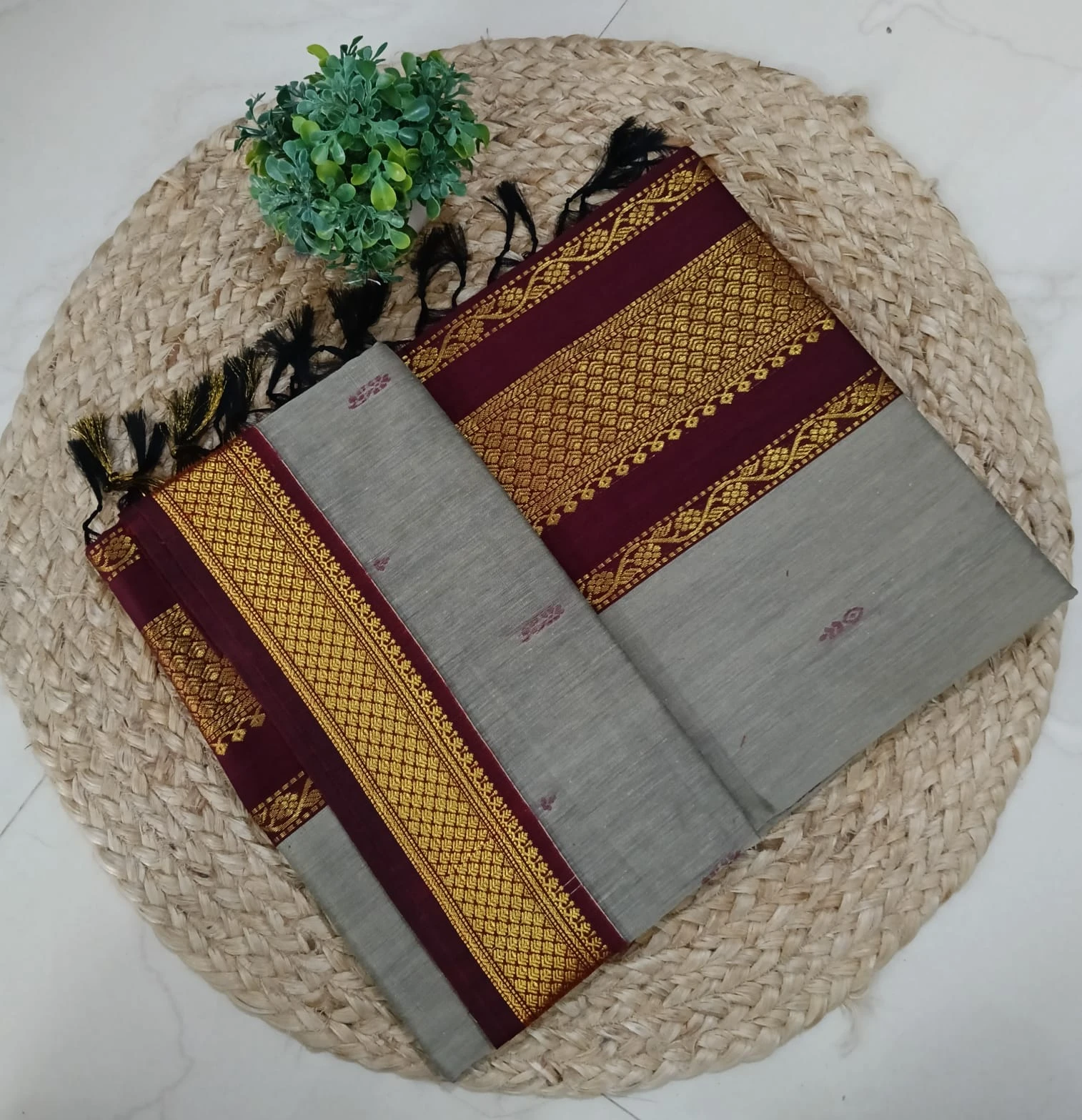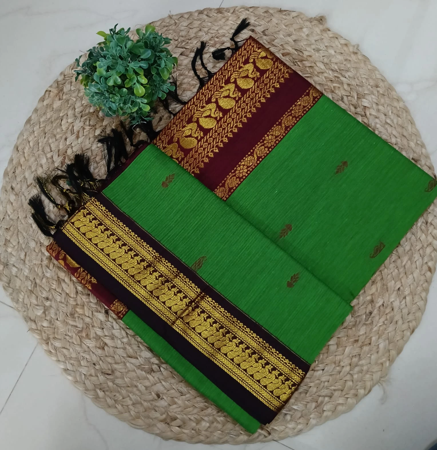 Features rich zari or woven borders that enhance the saree’s classic appeal.