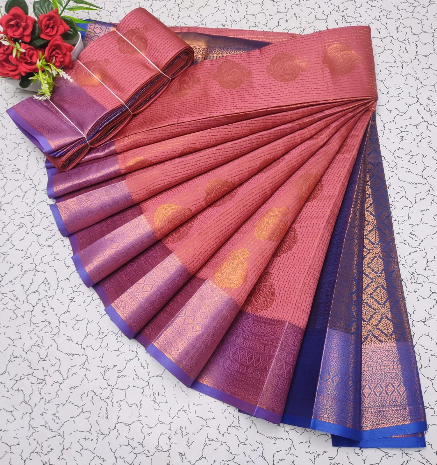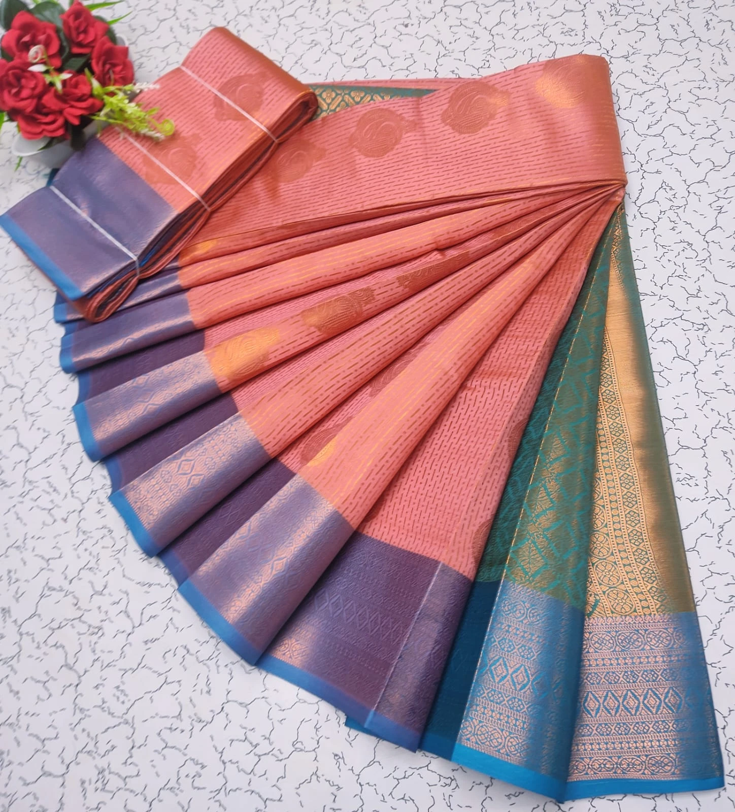Beautiful peacock, paisley, and temple-inspired designs woven into the saree body.